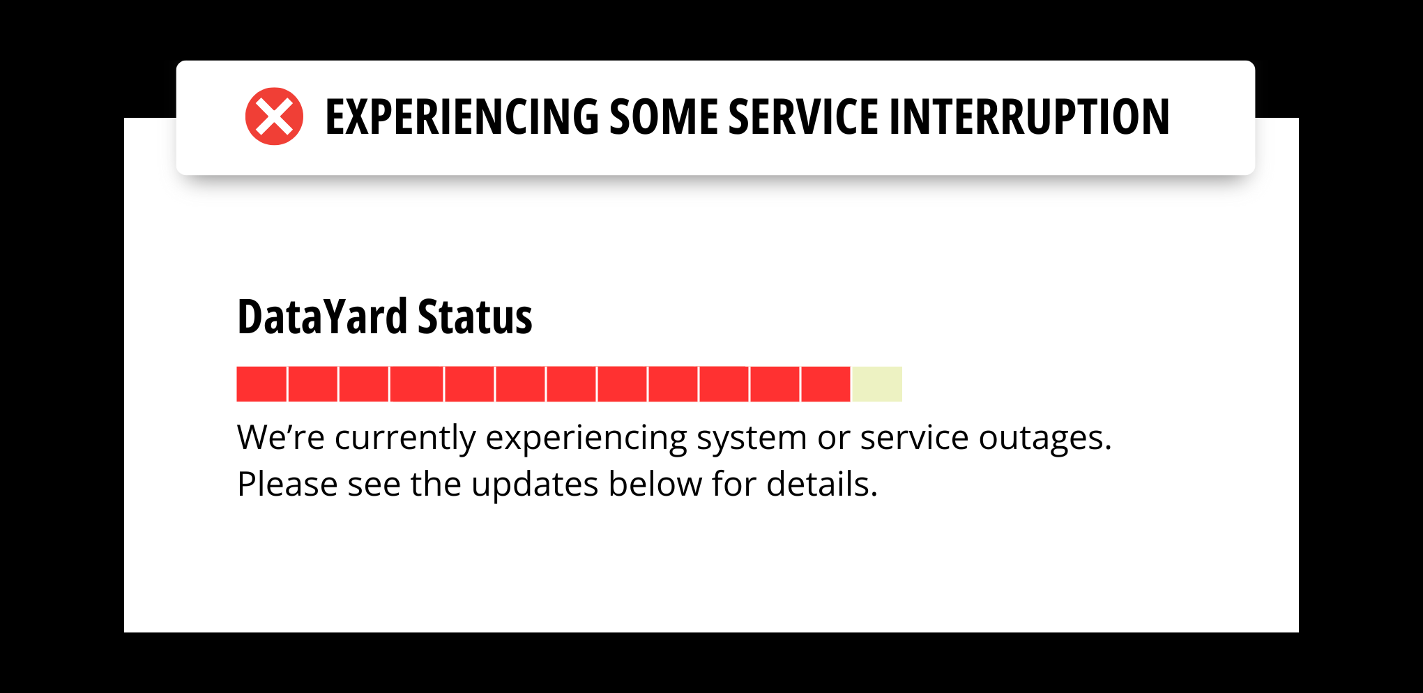 Service Update – Power has been lost at the DataYard datacenter, and we are actively working with AES to restore power as quickly as possible. Further updates will be provided regularly.